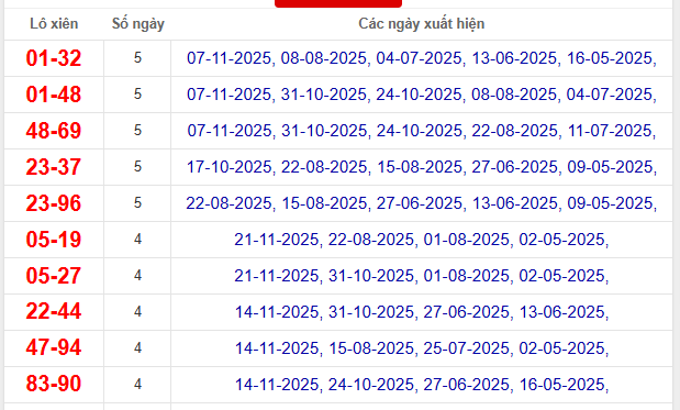 Thống kê lô xiên hay về gần đây: 01 – 32; 01 – 48; 48 – 69; – 23 – 37